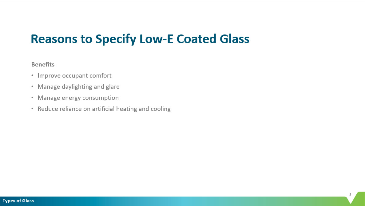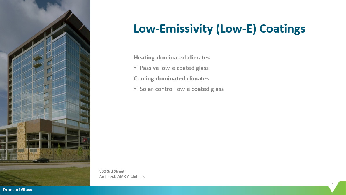 Ideal for heating-dominated climates, passive low-e coated glass allows some of the sun’s short-wave infrared energy to pass through. This helps heat a building, while still reflecting the interior long-wave heat energy back inside.