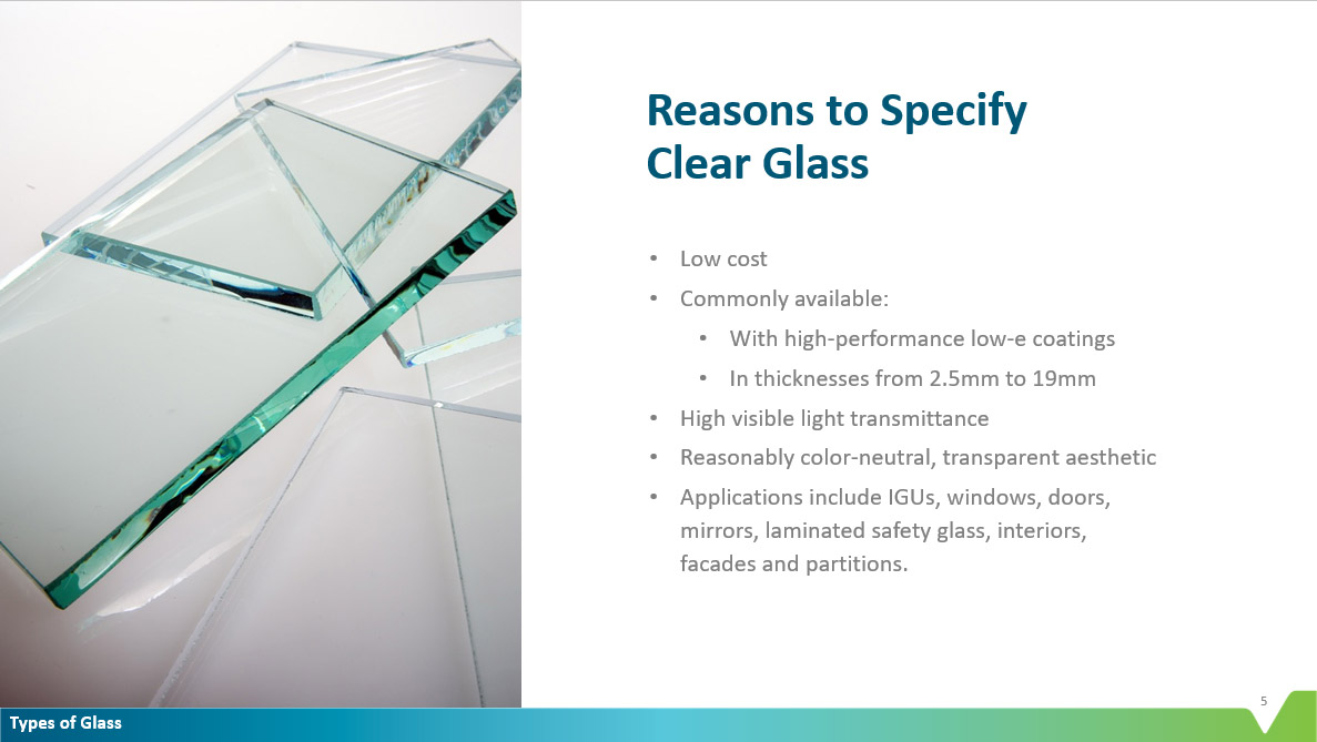 Clear glass is the most commonly used type of glass and is available in a variety of thicknesses. It typically has high visible light transmittance and reasonable color neutrality and transparency, though its green hue intensifies as the thickness increases. The color and performance of clear glass varies by manufacturer due to a lack of a formal color or performance specification defined by ASTM International.