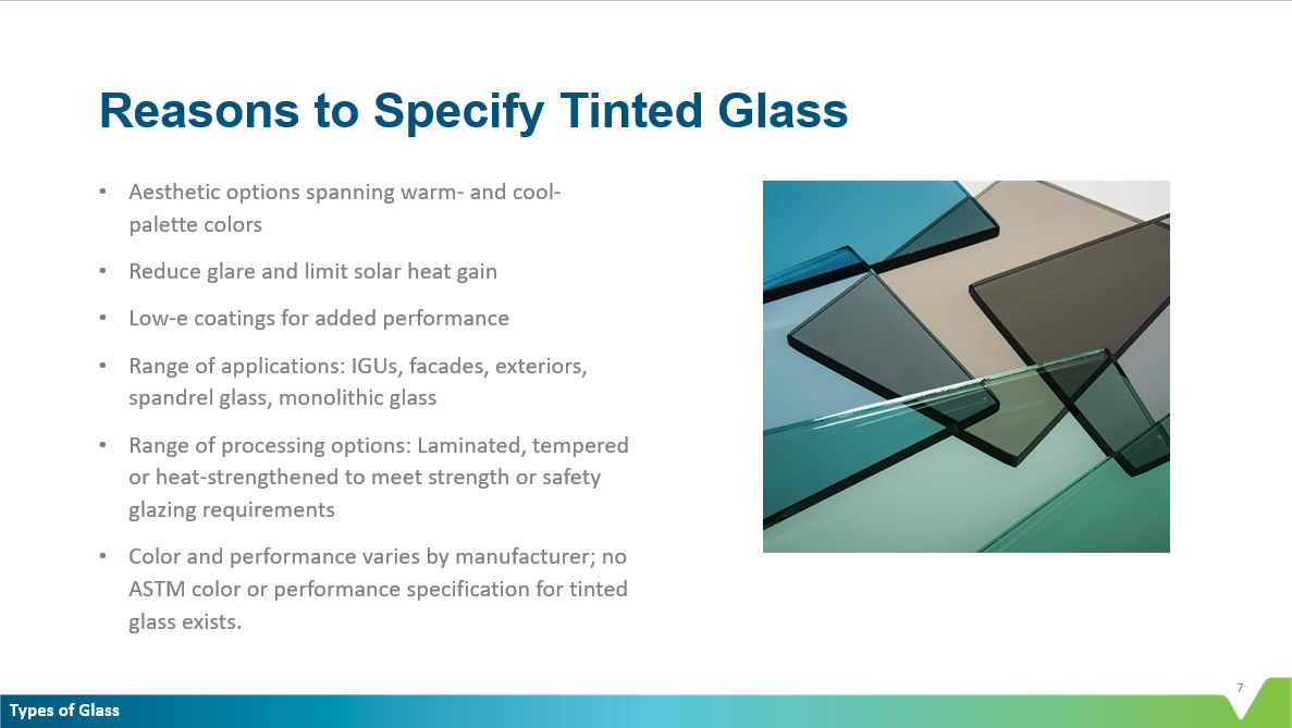 Created by incorporating a minor admixture into the glass during manufacturing, tinted glass provides neutral warm or cool-palette colors, such as blue, green bronze and gray. It also features a wide range of tints from light to medium to dark without affecting the basic properties of the glass, though they do affect heat and light transmittance to varying degrees. In addition, tinted glass can be laminated, tempered or heat-strengthened to satisfy strength or safety requirement. Much like clear glass, the color and performance of tinted glass varies by manufacturer because no ASTM color or performance specification for tinted glass exists.