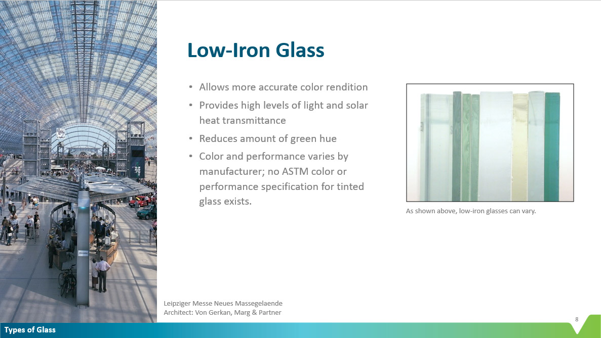 Low-iron glass typically is specified because it features a just percent of the iron content of regular glass, allowing it to transmit 91 percent of light compared to 83 percent of regular glass, without the greening effect associated with clear glass panels. Low-iron glass also features a high degree of clarity and color fidelity.